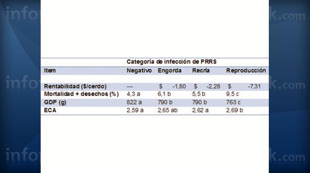 Diversos autores han descrito el impacto económico y productivo que generan las enfermedades en el cerdo, entre ellos, Steve Dritz, de la Universidad de Kansas State, ha reportado las pérdidas económicas de algunas enfermedades del cerdo, este menciona que el PRRS afecta dependiendo de la dinámica de infección que este posea, existiendo granjas que poseen infección en la fase de reproducción, en la fase de recría o de engorda: En las granjas donde la infección es el sitio de hembras, el virus puede ser detectado en los lechones al destete, mientras que cuando la infección se desplaza a la recría, los cerdos al destete son negativos, pero se roconvierten en esta fase, y a la engorda los cerdos son positivos en sangre en la última semana a venta. Según donde se localice la infección, el impacto económico y productivo de la infección es diferente, siendo en la reproducción donde el virus genera la mayor pérdida económica para una empresa porcina (ver tabla 1).