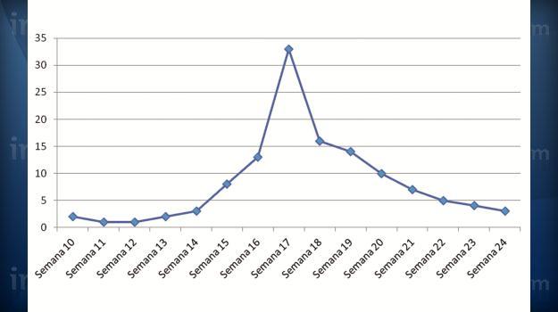 Un productor de cerdos que posee una granja de 2700 cerdas y un flujo semanal de 1500 cerdos, registra que gran cantidad de mortalidades está ocurriendo entre las 15 y 20 semanas de edad, a causa de enfermedad respiratoria, concentrándose el 28% de las muertes en la semana 17 (tabla 3).