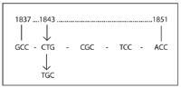 Figura 1. Secuencia nucleótidos del gen Ryrl que muestra la mutación en la posición 1843 (Fuji y col., 1991)