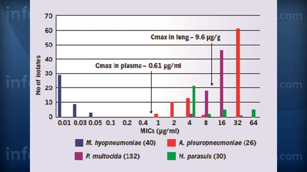 Utilizando los datos de inyección de tiamulina (McKellar et al, 2004) las concentraciones de plasma pueden ser adecuados alcanzado para inhibir Mycoplasma hyopneumoniae pero no las bacterias respiratorias tales como A. pleuropneumoniae, Haemophilus parasuis o Pasteurella multocida, que todos tienen mucho mayor PRM. Otra acción PK es probable que se tiene un impacto. Se considera improbable que es directamente concentración de pulmón, ya que las bacterias se encuentran fuera de la célula de pulmón. Puede ser que sea fluido bronquial, que se considera importante para la mayoría de los antibióticos. lo También se considera probable que es la concentración de tiamulina en polimorfos o los macrófagos, los cuales hundir la bacteria que está jugando un papel clave. Nielsen Y Szancer (1998) mostraron concentraciones muy altas de tiamulina acumulan en polimorfos. Esto ha sido postulado para otros antibióticos como la tilmicosina y tulatromicina.