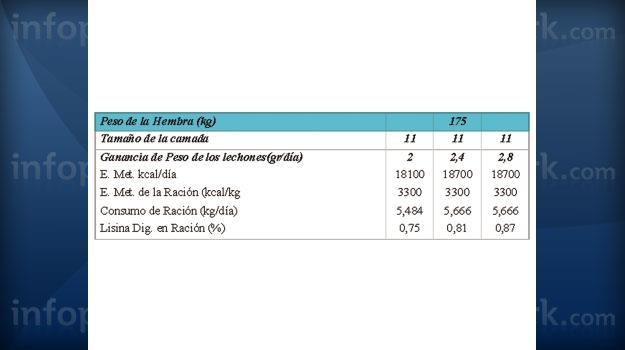 En general debemos tomar en cuenta las necesidades diarias, dependiendo fundamentalmente del peso de la cerda, la cantidad de lechones, la edad del destete y fundamentalmente de la ganancia de peso diaria de los lechones o de la camada.