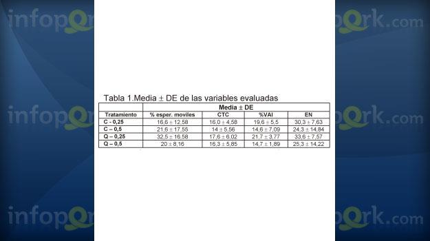 Se encontró un mayor promedio de espermatozoides móviles para el tratamiento con quercetina empacado en pajillas de 0,25 ml.