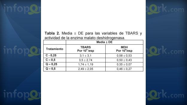 Si bien no se encontraron diferencias significativas, se observaron mejores resultados en los parámetros espermáticos para los tratamientos empacados en pajillas de 0,25 ml tanto en el control como con quercetina. De otro lado, se encontró una fuerte disminución en el promedio de TBARS para los tratamientos con antioxidante. La actividad de la enzima MDH se encontró levemente disminuida en los tratamientos con quercetina.