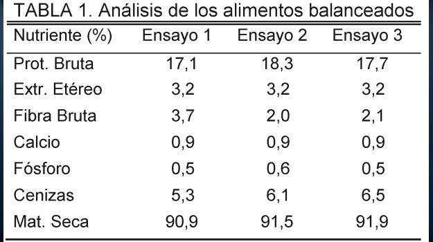 En un establecimiento porcícola del partido de Bahía Blanca, pcia. de Buenos Aires, se realizaron tres ensayos con dos tratamientos cada uno en piquetes de 3 x 10 m. Por cada tratamiento se alojaron 11, 16 y 20 lechones en los ensayos 1, 2 y 3, respectivamente. Se suministró una mezcla de alimento balanceado elaborado por el productor: T (sin levaduras) y L [0,2 % de levadura de cerveza (Saccharomyces cerevisiae)] (Tabla 1).