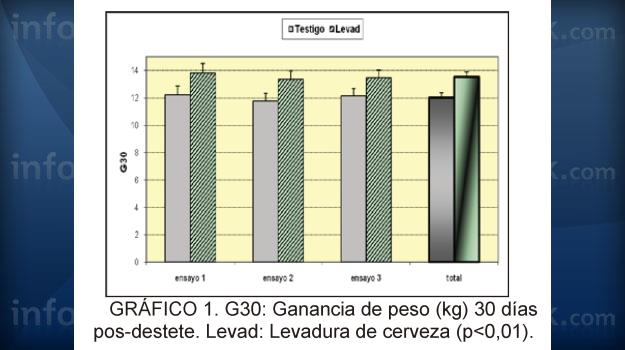 La ganancia de peso a los 30 días fue, en promedio, mayor en los lechones tratados con el probiótico (Gráfico 1) (p < 0,01), comportándose de la misma manera en todos los ensayos.