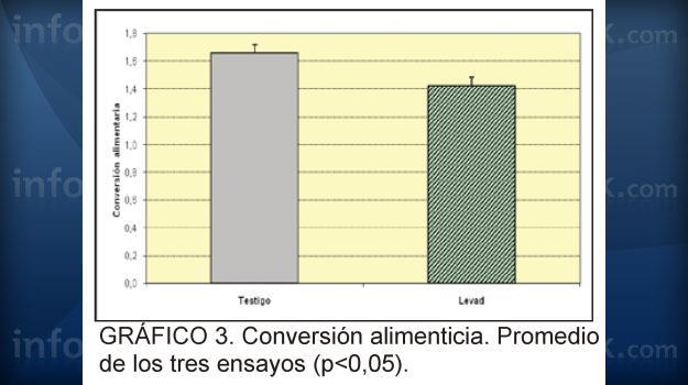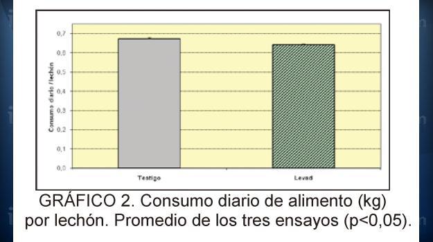 El consumo diario promedio de alimento por lechón (Gráfico 2) y la conversión alimenticia (Gráfico 3) fueron mayores en los grupos sin levadura (p < 0,05), recomendando trabajar con mayor número de ensayos para generalizar los resultados y así aumentar los grados de libertad.