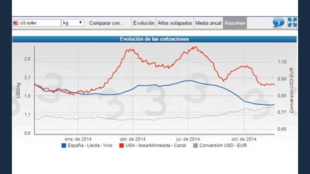 Figura 2. Comportamiento del precio del cerdo en EEUU y España durante el 2014. Fuente: www.3tres3.com