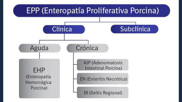 Existen diferentes formas de presentación de la enfermedad (Figura 2). Los animales con infección clínica aguda desarrollan una diarrea sanguinolenta que a menudo incide en la muerte de los individuos afectados, denominándose este cuadro como enteritis proliferativa hemorrágica o PHE (según sus siglas en inglés) y siendo característico de animales en fase de producción cercana a venta o hembras de reemplazo.
