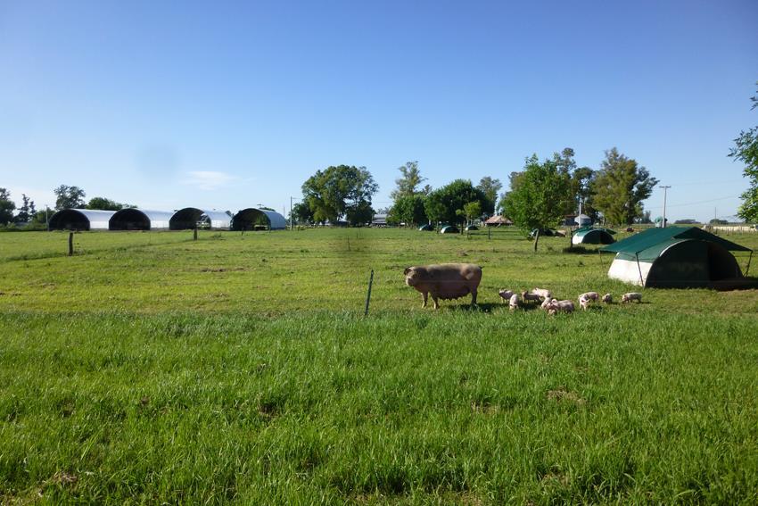 Es un sistema de producción de ciclo completo que vende capones con un peso promedio de 110Kg. Está conformado por un galpón de servicio-gestación confinado, lotes de lactancia al aire libre, y galpones de cama profunda para recría, desarrollo y terminación. A futuro habrá una maternidad confinada como también un lote a campo para realizar las etapas de desarrolloterminación, con el fin de poder efectuar comparaciones entre diferentes tipos de sistemas.