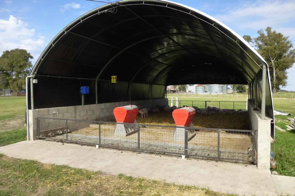 La recría (8 a 30Kg) se lleva adelante en dos galpones de cama profunda diseñados para esta categoría, cuya superficie son de 72 m2. Del lado norte de los galpones se colocó un piso de hormigón con la particularidad que en un sector se utilizó piso slat con una fosa (área donde se encuentran los bebederos).